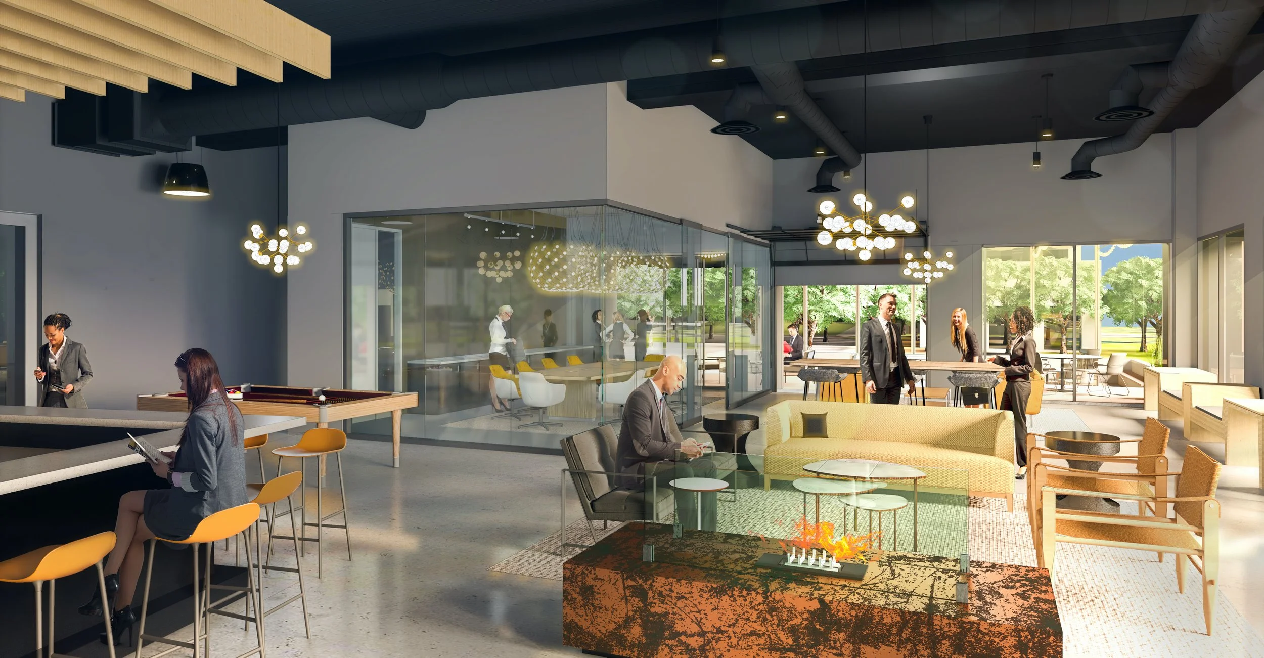 The space is designed with an emphasis on functionality and flexibility, featuring modern furnishings and thoughtful layouts that encourage interaction and collaboration. The use of glass walls and natural lighting creates an open and inviting atmosphere, while maintaining a professional and sophisticated aesthetic. The amenity space is equipped to support a range of activities, from casual meetings to formal events, making it a versatile addition to the campus.
