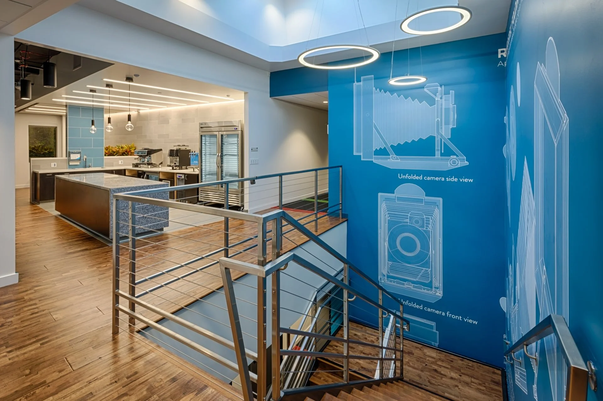 A standout feature of the project is the design of the breakrooms on each floor. These spaces are not only functional but also creatively reflect the scientific theme of their respective floors. The overall design was inspired by the seven elements of nature, integrating natural materials like polished concrete, moss wall accents, and wood finishes throughout. This approach created a workspace that balances functionality with an engaging, thematic experience, fostering both creativity and collaboration among employees.