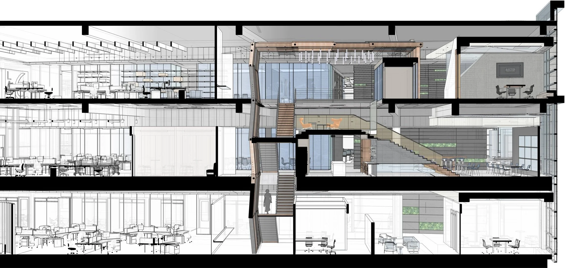 The Alector Headquarters project in South San Francisco was a comprehensive interior design effort aimed at capturing the company’s pioneering spirit and commitment to curing cancer. The centerpiece of the three-story space was a feature staircase that seamlessly integrated gathering spaces, storage, an all-hands meeting area, and a stylish breakroom, embodying Alector’s dynamic and collaborative culture.